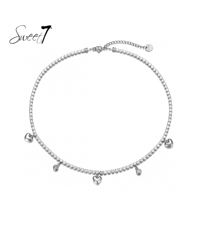 Zilverkleurige korte halsketting zirconia steentjes en hartjes.