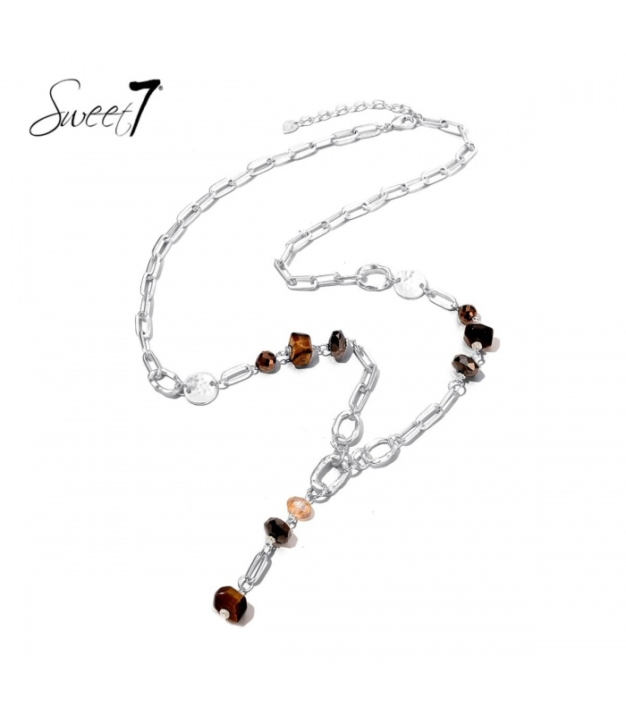 Deze stijlvolle zilverkleurige lange halsketting is een prachtig accessoire dat elke outfit verfraait. De ketting is versierd met bruine natuurstenen kralen, die warm en aards aandoen in contrast met het koele zilver. Deze combinatie zorgt voor een tijdloze en veelzijdige look.