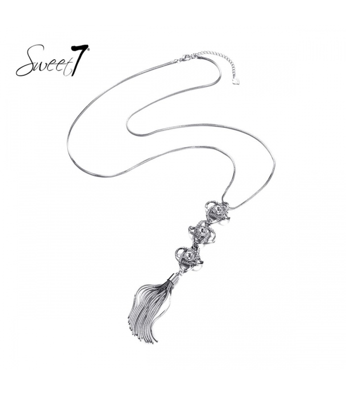 Zilverkleurige Lange Halsketting met Prachtige Elementen en Metalen Franje.