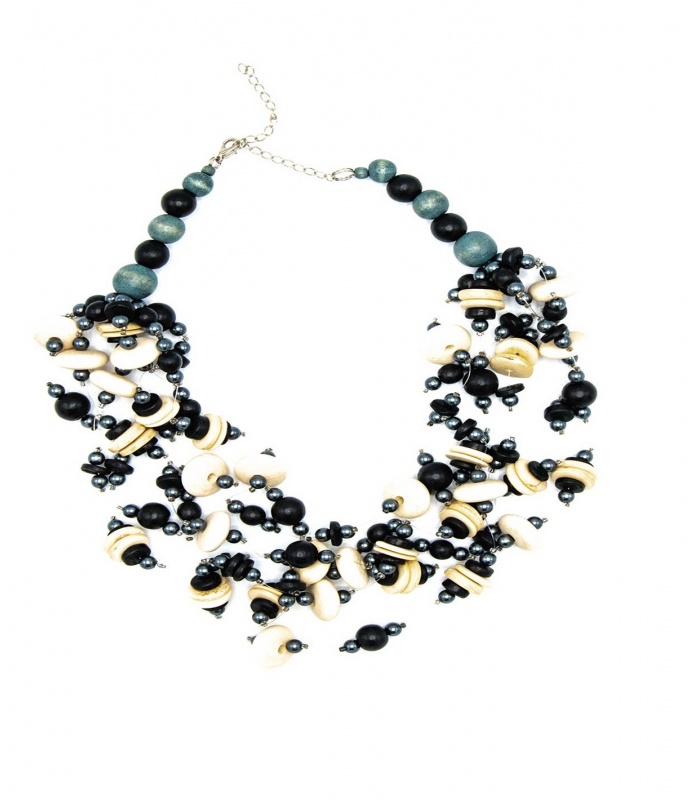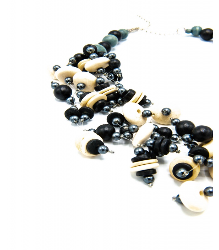 kralenhalsketting met zwarte, grijze en witte deels houten kralen.