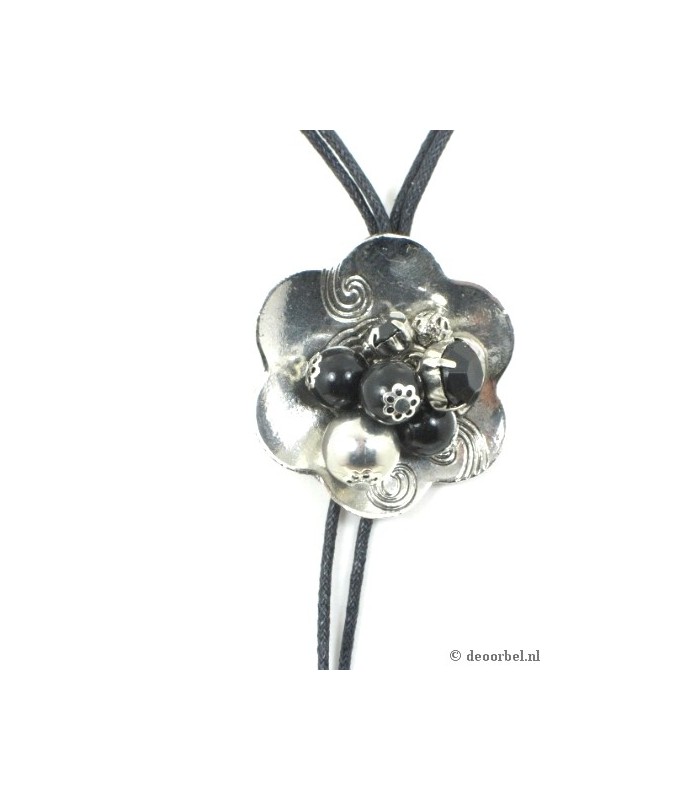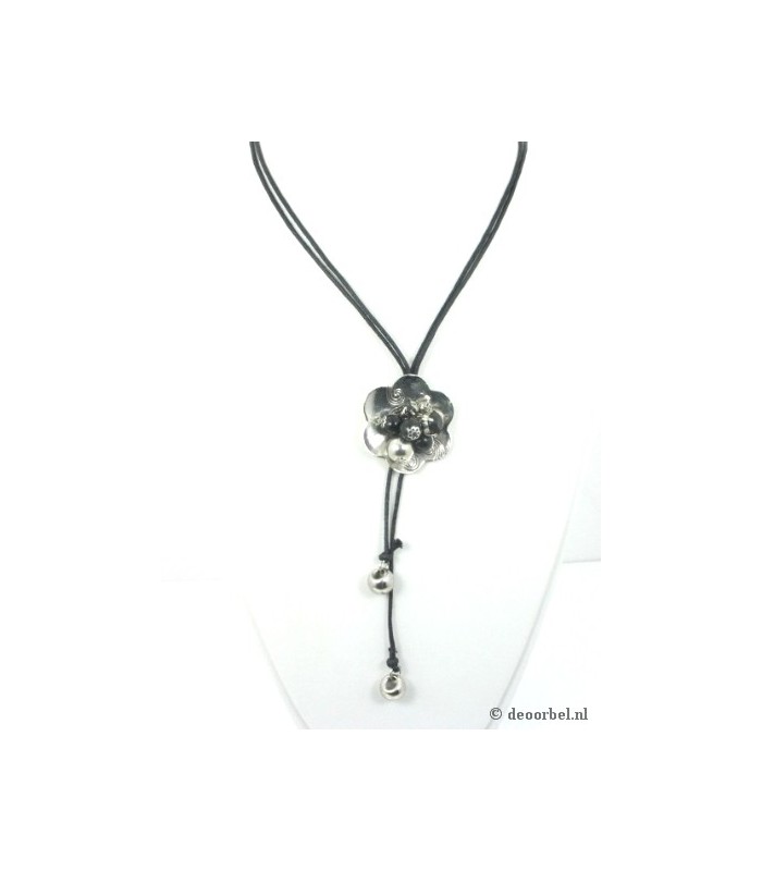 Mooie koordhalsketting met metalen hanger en kralen. Lengte van de halsketting is 58 cm. Verstelmogelijkheid van 8,5 cm