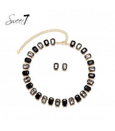 Deze halsketting is gemaakt van zwarte glas kralen. Het elegante ontwerp geeft elke outfit een stijlvolle uitstraling. De bijpassende oor knopjes zorgen voor een complete look, perfect voor een avondje uit of een feestelijke gelegenheid. Combineer deze set met andere accessoires voor een extra chique touch.
