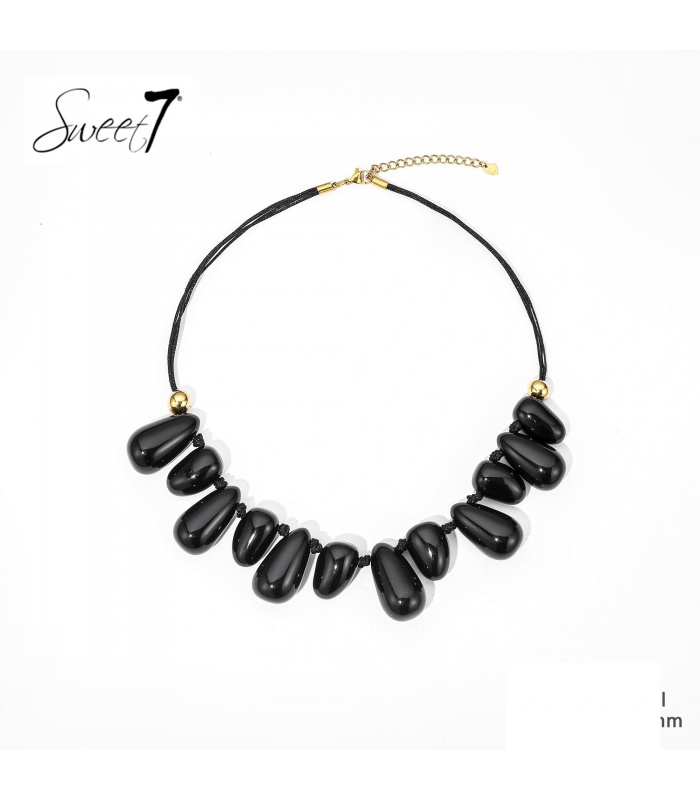 Hoe maak je een krachtig statement zonder te overdrijven? Deze halsketting met glanzende zwarte druppelvormige kralen geeft een elegante en moderne uitstraling. De subtiele goudkleurige details zorgen voor een vleugje luxe.