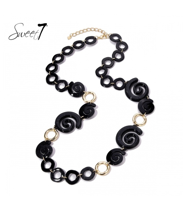 Hoe maak je jouw outfit direct krachtiger? Deze halsketting combineert zwarte, glanzende spiralen met open cirkelvormen en subtiele goudkleurige schakels. Het resultaat is een opvallend maar elegant sieraad dat jouw nek lijn prachtig accentueert. Perfect voor wie houdt van unieke statement kettingen.