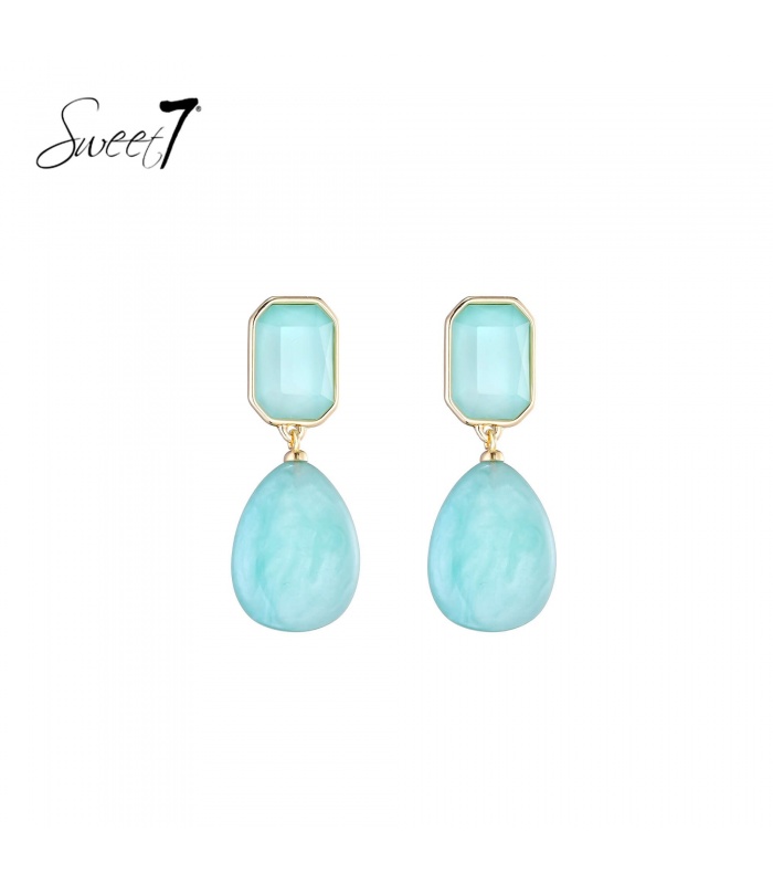 Welke oorbellen doen denken aan helder water en zomerse lucht? Deze duo van turquoise tinten vangt die frisse energie perfect. De combinatie van een facetgeslepen steen en een marmerlook druppel creëert een verfijnd contrast, omlijst met een subtiel goudkleurig randje.