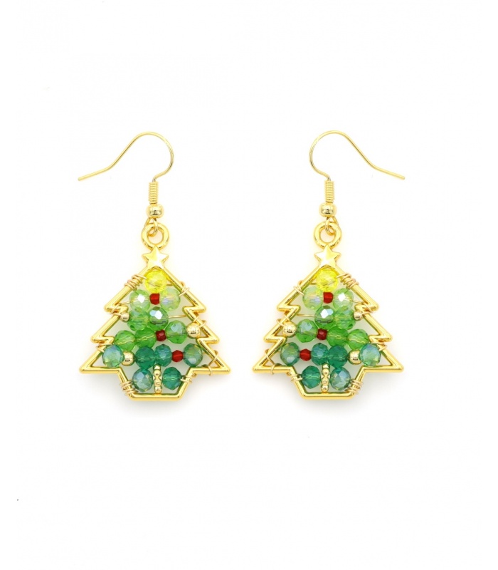 Hoe voeg je moeiteloos feestvreugde toe aan je outfit? Deze oorbellen in kerstboomvorm combineren glanzend goudkleurig metaal met sprankelende kralen in groen, rood en goud. Ze zorgen direct voor een vrolijke en feestelijke uitstraling tijdens elk kerstmoment.