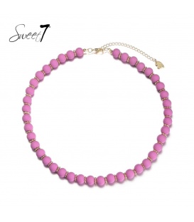 Paarse korte halsketting met goudkleurige elementen. De lengte van de halsketting is circa 45 a 50 cm cm. De ketting heeft een verlengkettinkje van 7 cm.