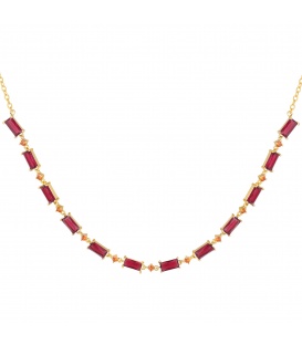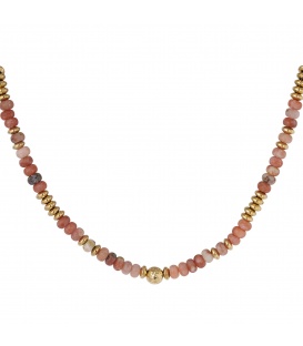 Roze korte halsketting met goudkleurige elementen. De lengte van de halsketting is circa 40 a 42 cm. De ketting heeft een verlengkettinkje van 5 cm.