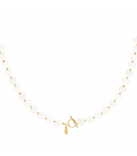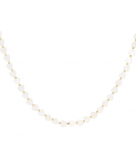 Goudkleurige korte halsketting met witte glas kralen. De lengte van de halsketting is circa 38 cm. De ketting heeft een verlengkettinkje van 5 cm.