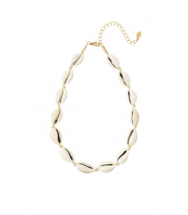 Goudkleurige korte halsketting met kleine schelpen. De lengte van de halsketting is circa 34 cm. De ketting heeft een verlengkettinkje van 7 cm