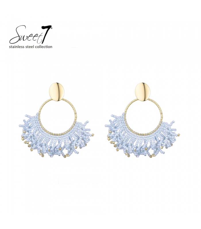 Deze oorbellen combineren een goudkleurige ring met lichtblauwe kralen voor een speelse fashion oorbel look. Perfect als statement oorbellen die elke outfit luchtig en stijlvol maken.
