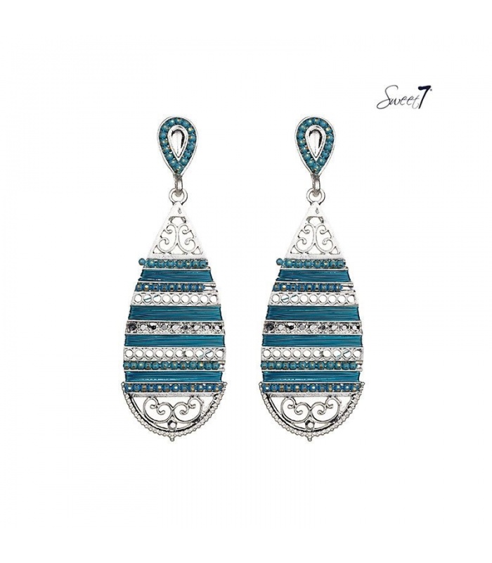 Zilverkleurige boho oorhangers met blauw draad en steentjes.