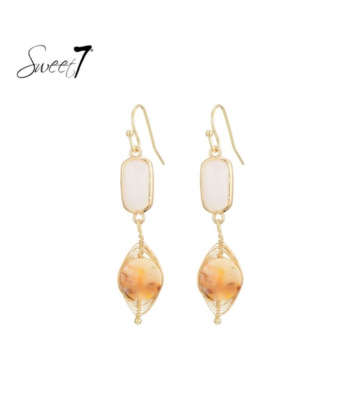Beige oorhangers met een natuursteen en een goudkleurige rand.