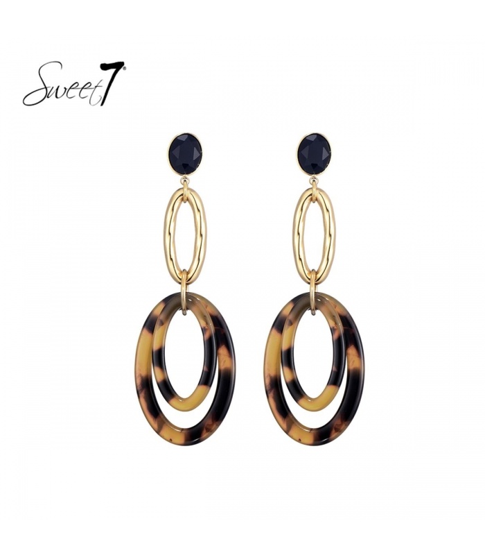 Bruine dierenprint oorhangers met een zwart oor knopje en goudkleurige schakels