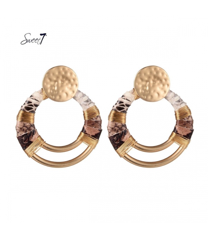 Ontdek de perfecte combinatie van elegantie en modern design met deze prachtige Sweet 7 oorbellen. Het unieke ronde ontwerp is vervaardigd uit goudkleurig metaal en afgewerkt met luxe lederen details in warme aardetinten, vakkundig omwikkeld met gouden draad. Deze statement oorbellen voegen een verfijnde en trendy touch toe aan elke outfit, ideaal voor zowel casual als formele gelegenheden. Draag ze om je look compleet te maken en straal met een accessoire dat stijl en klasse uitstraalt. Perfect voor modebewuste vrouwen die houden van kwaliteit en design.