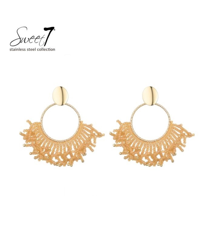 De speelse kralenrand die elke beweging vangt en glans geeft. Deze oorbellen combineren een ronde vorm met warme tinten. Perfect als statement oorbel of trendy sieraad voor elke dag.