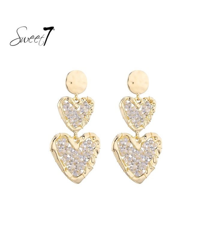 Op zoek naar oorbellen die romantiek en glamour samenbrengen? Deze hartvormige oorbellen van Sweet7 stralen liefde uit in elke beweging. De dubbele hartjes zijn verfijnd afgewerkt met transparante steentjes en een organisch gevormde goudkleurige rand, alsof ze met de hand gesmeed zijn uit puur gevoel.