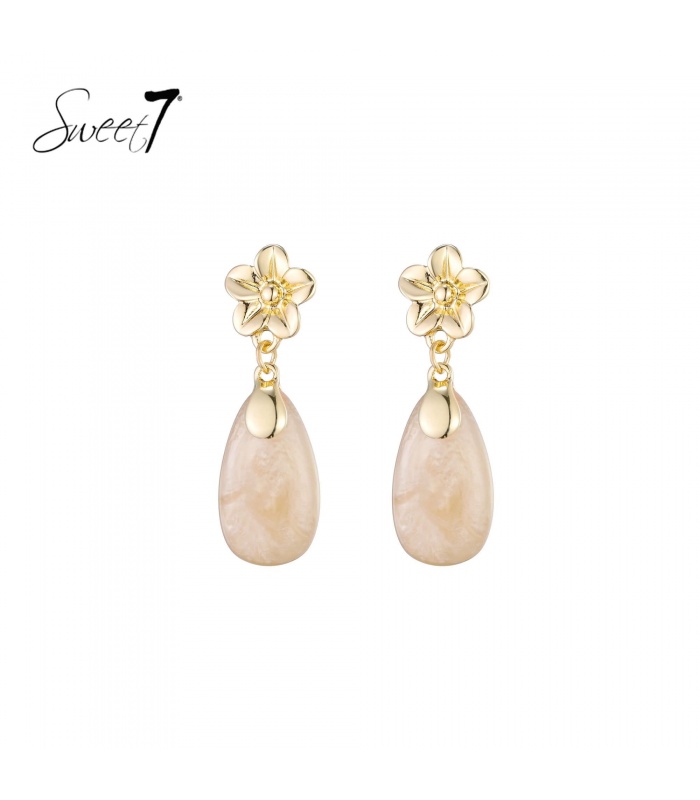 Hoe geef je een look direct een verfijnde, zachte uitstraling? Deze oorbellen combineren een glanzend bloemenaccent met een druppelvormige hanger in beige marmerlook. De subtiele schakeling tussen goud en neutrale tinten zorgt voor een elegante balans die past bij elk moment van de dag.