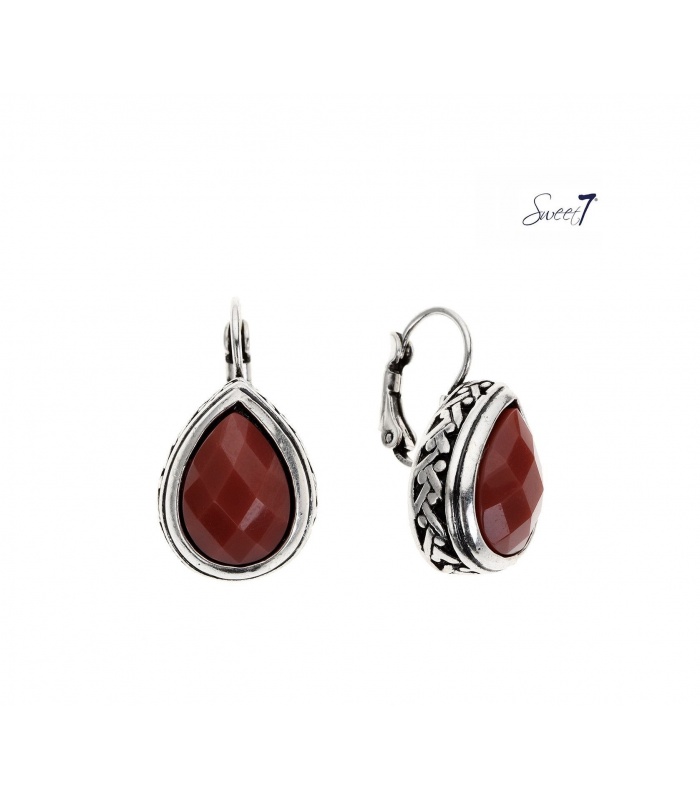 Oorbellen met een bruinrode inleg en zilverkleurige bewerkte rand.