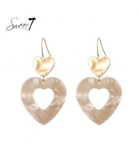 Beige harten oorhangers en een goudkleurig hartje De lengte van deze oorbel is circa 3.5 cm. Voor oren met gaatjes. De oorbellen zijn nikkelvrij. De oorbellen zijn voorzien van stoppertjes.