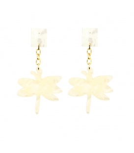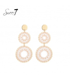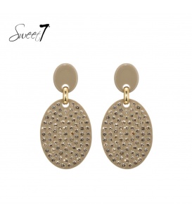 Beige oorhangers met motief De lengte van deze oorbel is circa 7 a 8 cm. Voor oren met gaatjes. De oorbellen zijn nikkelvrij. De oorbellen zijn voorzien van stoppertjes.