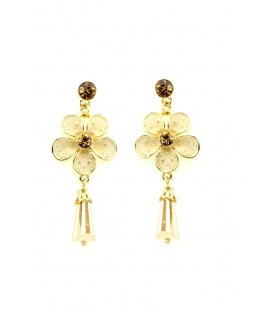 Goudkleurige oorhangers met een beige bloem en bedels De lengte van deze oorbel is circa 6.80 cm. Voor oren met gaatjes. De oorbellen zijn nikkelvrij.