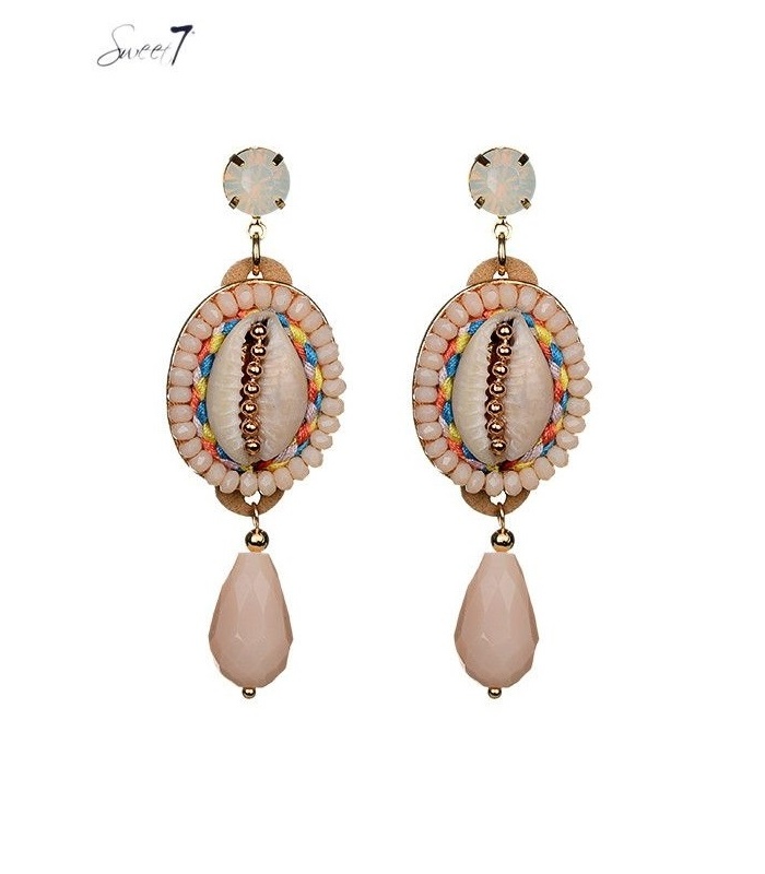 Creme oorhangers van kralen, gekleurd koord en schelp.