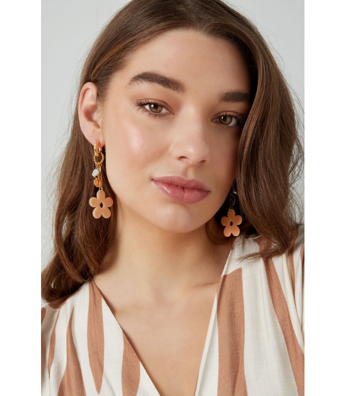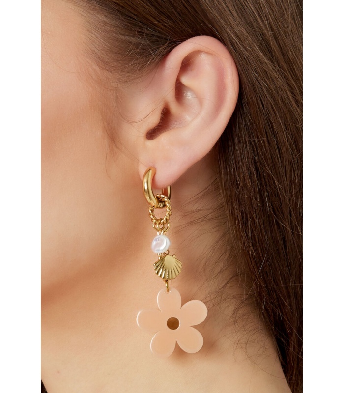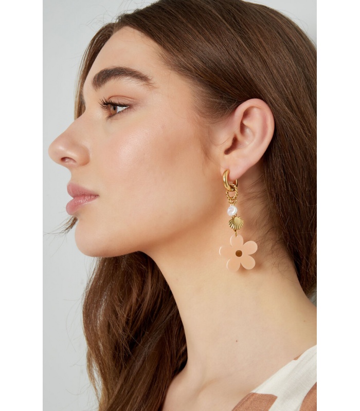 Goudkleurige oorhangers, verrijkt met een subtiele beige bloem en verfijnde bedels. Deze oogstrelende juwelen vormen de perfecte aanvulling op elke outfit, van casual tot chique avondkledij. Hun unieke ontwerp brengt een vleugje elegantie en verfijning, ideaal voor de moderne vrouw die streeft naar een stijlvolle uitstraling.