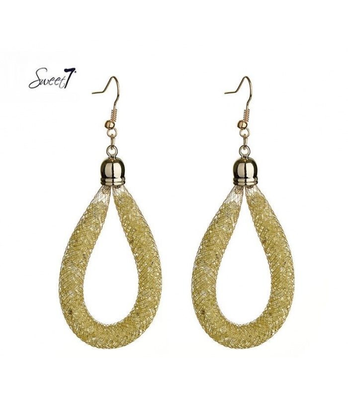 Oorhangers met ovale hanger van nylon mesh met daarin kleine mosterdgele kunststof glitter steentjes.
