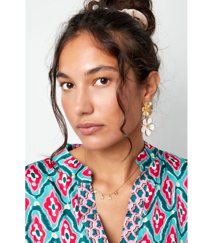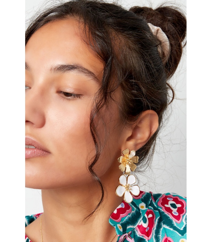 Goudkleurige Oorhangers met Zwarte Bloemen.