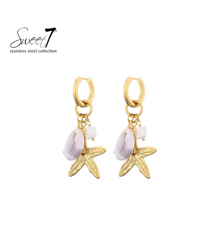 Oorbellen goudkleurig met witte schelpjes en zeester.