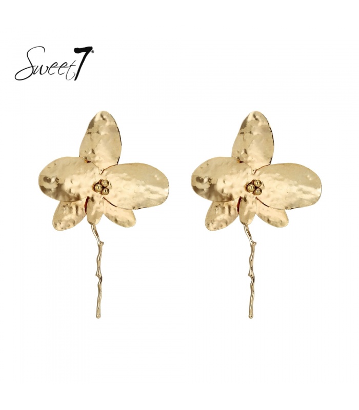 Zoek je een opvallende oorbel die je look direct naar een hoger niveau tilt? Deze gouden oorbellen in de vorm van een bloem combineren een gehamerd motief met een speels hangend detail. De subtiele glans en het organische design maken ze perfect voor elke fashion liefhebbers die houdt van een elegante statement. Ideaal voor feestjes of als eyecatcher bij een basic outfit.