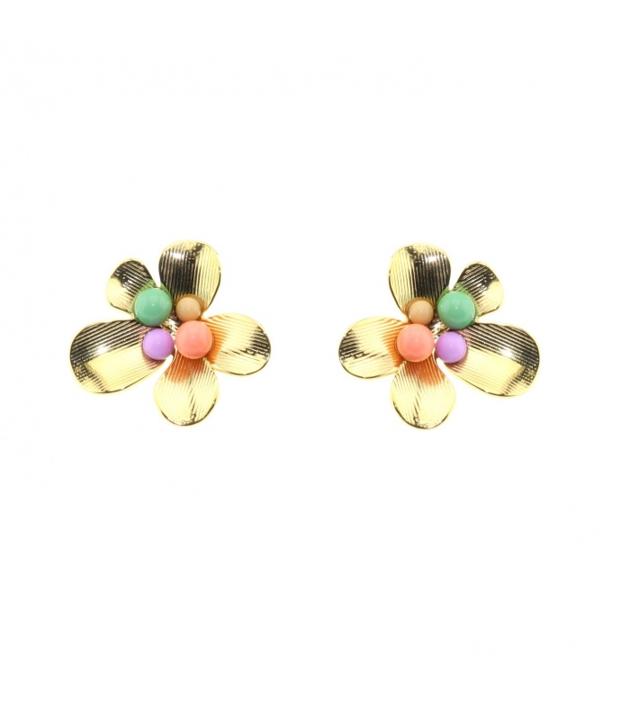 Goudkleurige bloemen oorhangers met gekleurde kraaltjes in het midden
