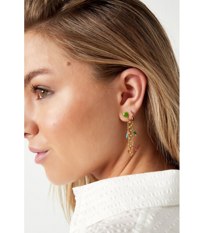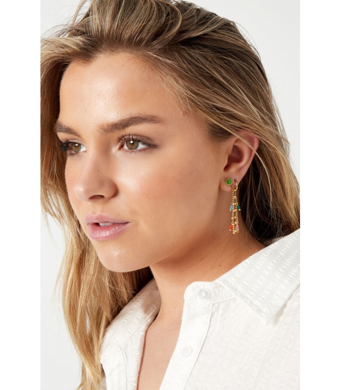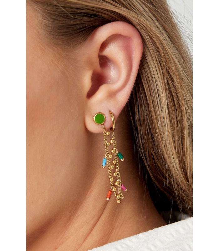Goudkleurige dubbele oorhanger met gekleurde glas kralen ( 1 stuks)