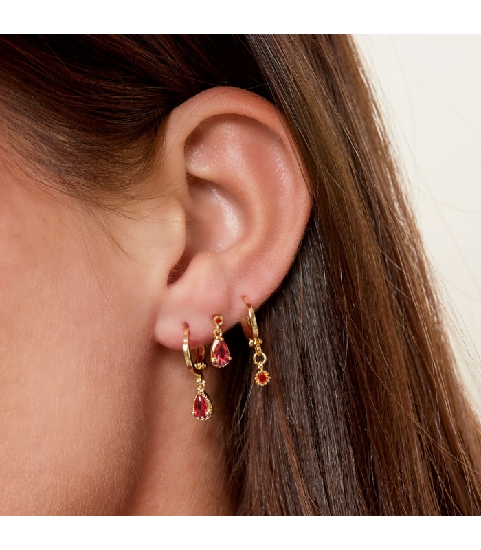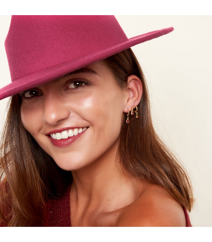 Goudkleurige oorbellen met een donkerroze druppel steentje