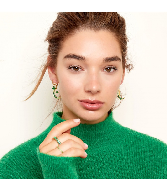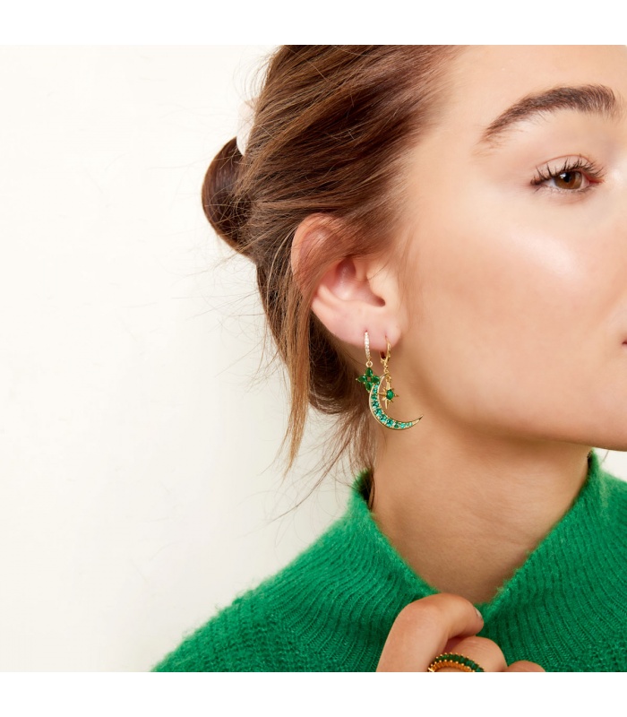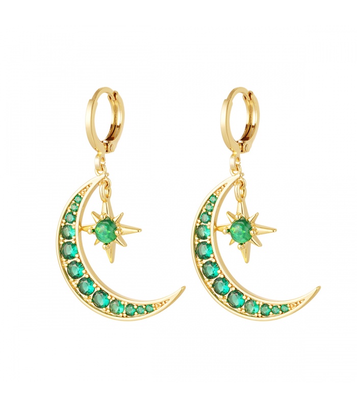 Goudkleurige oorbellen met een hangertje in de vorm van een maan en sterretje.