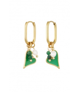 Deze verfijnde goudkleurige oorbellen combineren een groen hartje met een subtiel pareltje, wat zorgt voor een charmante en romantische uitstraling. De warme gouden afwerking geeft een luxueus accent dat zowel casual als chique outfits moeiteloos aanvult. Het delicate ontwerp voegt een vleugje elegantie toe, perfect voor elke gelegenheid.