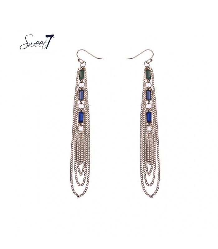 Goudkleurige oorbellen met strengen en blauw,groen gekleurde steentjes