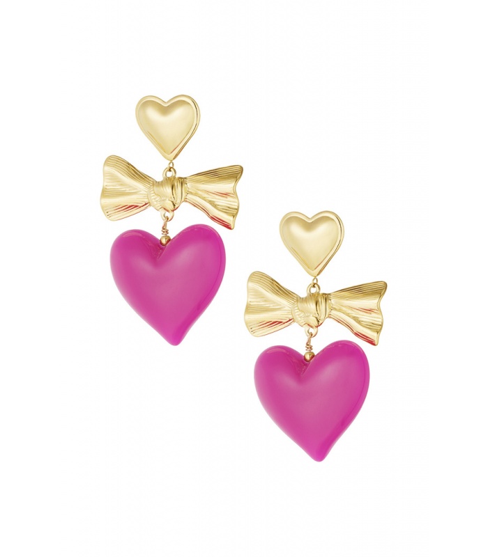 Deze goudkleurige oorbellen met een charmante strik en een speels fuchsia roze hartje brengen een frisse en romantische touch aan jouw look. De warme gouden tint harmonieert prachtig met het levendige roze hart, waardoor deze oorbellen opvallen zonder te overdrijven.