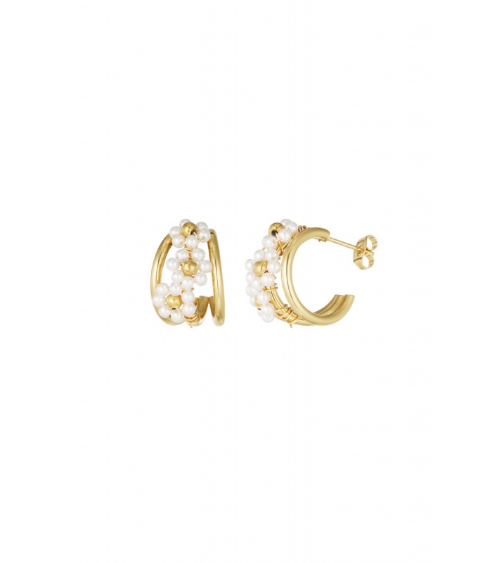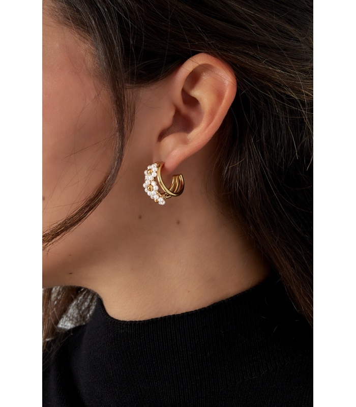 Deze goudkleurige oorbellen met charmante witte bloemetjes van acrylpareltjes voegen een romantisch en verfijnd accent toe aan je look. De delicate bloemetjes, gemaakt van glanzende acrylpareltjes, geven een zachte uitstraling die perfect past bij zowel dagelijkse outfits als bij feestelijke gelegenheden.