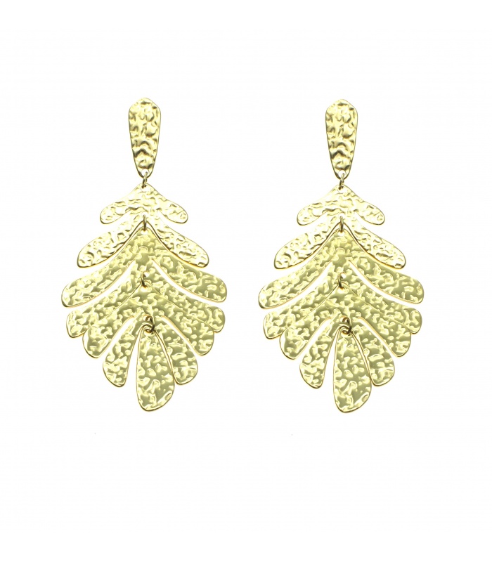 Goudkleurige oorhangers in de vorm van een blad en een bewerkt motief.