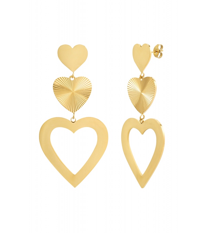Deze oorhangers zijn met zorg ontworpen, met een goudkleurige afwerking die zorgt voor een tijdloze glans. De drie hartvormige hangers dragen een diepgaande betekenis met zich mee - liefde voor jezelf, liefde voor anderen en liefde voor het leven. Draag deze oorhangers met trots en herinner jezelf eraan wat echt belangrijk is.