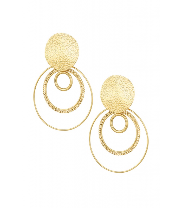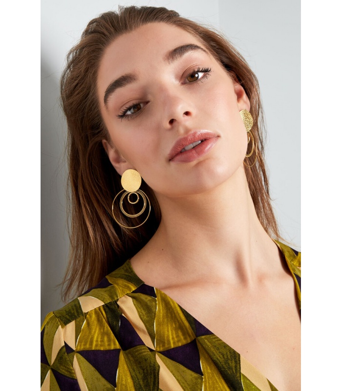 Goudkleurige oorhangers met cirkels en een bedrukt oorstukje