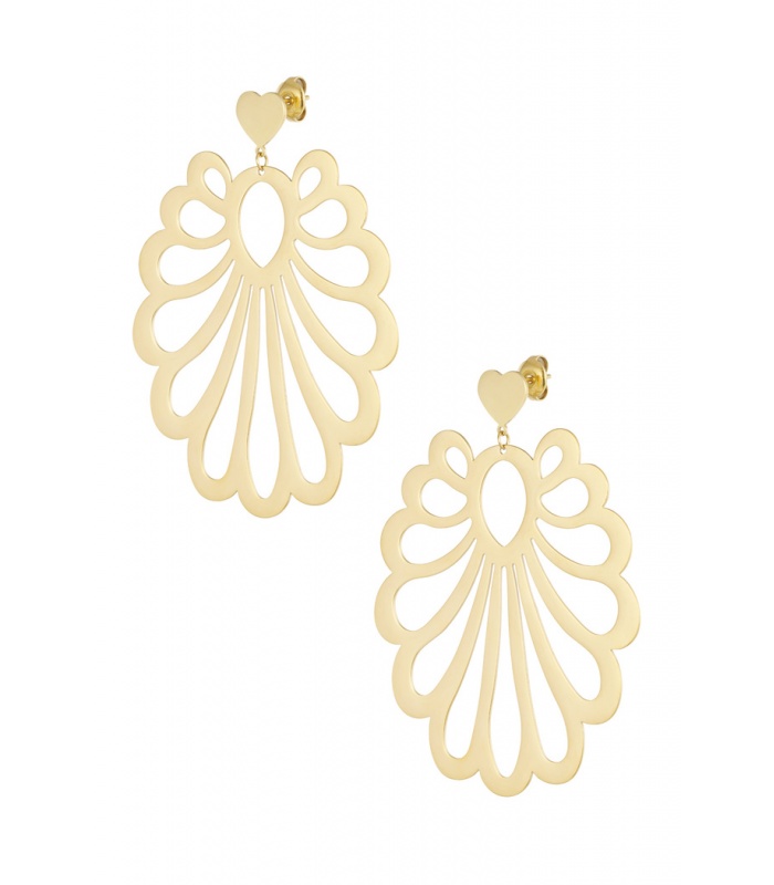 Goudkleurige oorhangers met een feestelijk patroon en een hartje als oor stukje