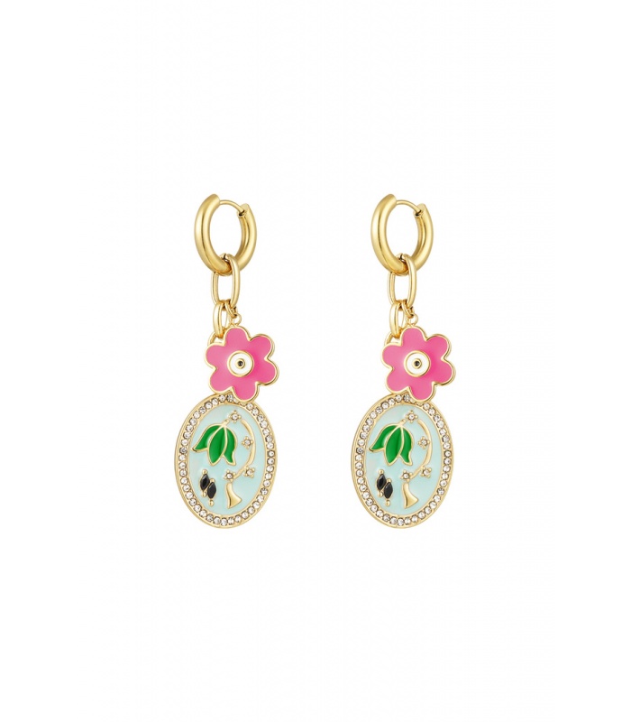 Deze elegante oorbellen combineren een goudkleurige afwerking met een subtiele groene bedel en een delicaat roze bloemetje. Ze voegen een vleugje kleur en verfijning toe aan elke outfit.