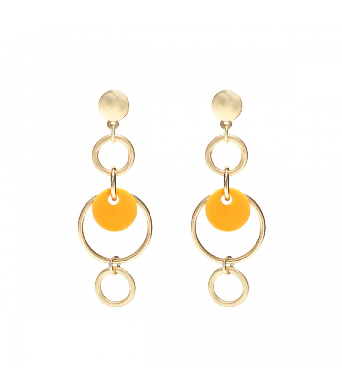 Goudkleurige oorhangers met een oker geel element in de hanger.