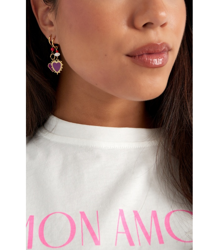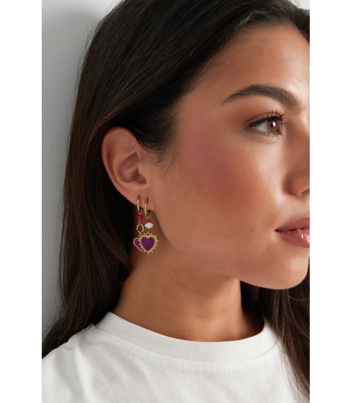Deze oorhangers combineren klassieke goudtinten met een eigentijds ontwerp, waardoor ze een tijdloze toevoeging zijn aan je sieradencollectie. Het paarse hartje voegt een vleugje kleur toe zonder afbreuk te doen aan de veelzijdigheid van het ontwerp. Perfect voor diegenen die op zoek zijn naar een stijlvol statement dat gemakkelijk kan worden gecombineerd met verschillende outfits, van casual tot chic.