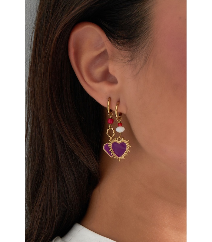 Goudkleurige oorhangers met een paars hartje en kralen.