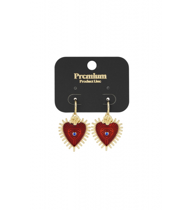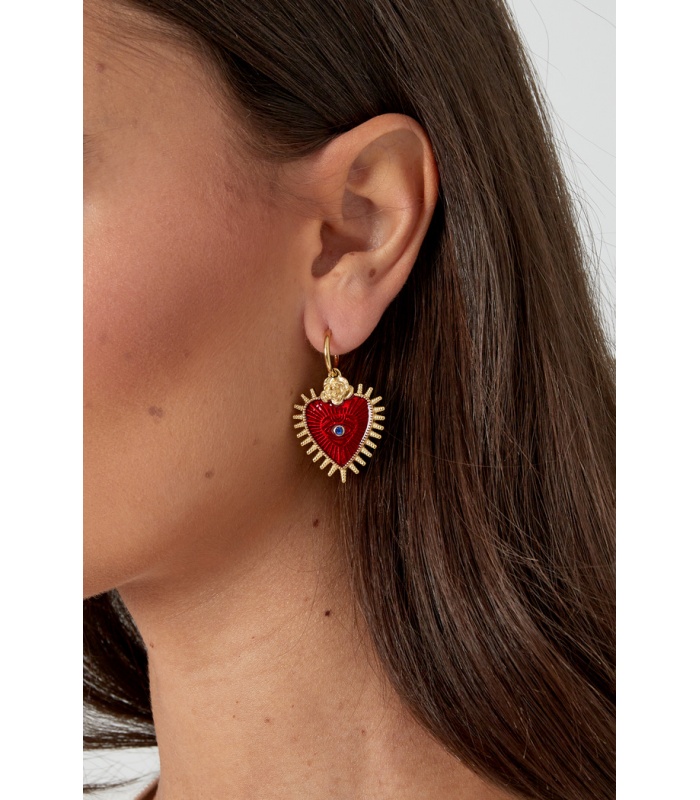 Deze goudkleurige oorhangers combineren een rood hart met een subtiel blauw steentje, wat zorgt voor een unieke en elegante uitstraling. Het contrasterende kleurenspel maakt ze een opvallende toevoeging aan elke outfit.