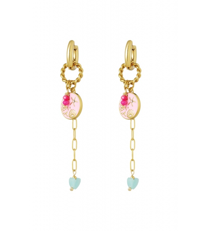 Deze goudkleurige oorhangers met roze bedels, kraaltjes en een hartje voegen een speelse elegantie toe aan je look. Het verfijnde ontwerp combineert de warmte van goud met de zachte tinten van roze, perfect voor zowel dagelijkse als feestelijke gelegenheden.